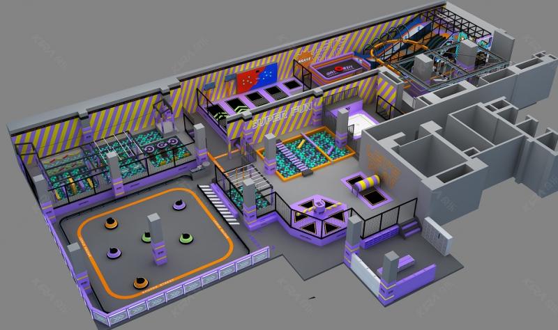 In recent years, indoor amusement center with more than a few thousand square meters have become more and more popular. This design covers a series of games like kids soft playground, rope course, trampoline, excavators, children's traffic city, building blocks, bumper car, laser tag, etc., which are suitable for the whole family to play together. The project is a good place for parent-child entertainment.